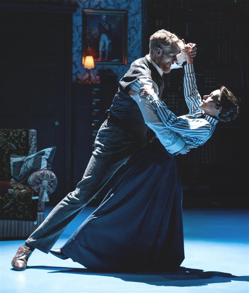 Eliza Doolittle (Sofie Topp Christensen) og Higgins (Peter Plaugborg) i arbejdsværelset. My Fair Lady, Det Ny Teater. Fotograf: Camilla Winther.