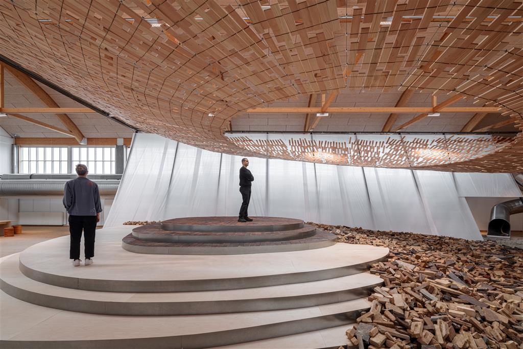 Går man endnu tættere på værkets naturlige materialevalg, der primært består af træ og tegl, hviler installationen på en hengivenhed til håndværket samt troen på materialernes integritet. I en video, der flankerer udstillingens tekster, fortæller Yuki Ikeguchi, partner i KKAA, om processerne bag værket og det tværfaglige samarbejde mellem arkitekter og producenter, der har muliggjort dets opførelse. Som besøgende får man indblik i materialernes bearbejdning hos de firmaer, der har leveret dem til installationen – douglastræ fra Dinesen og teglsten fra Petersen Tegl.