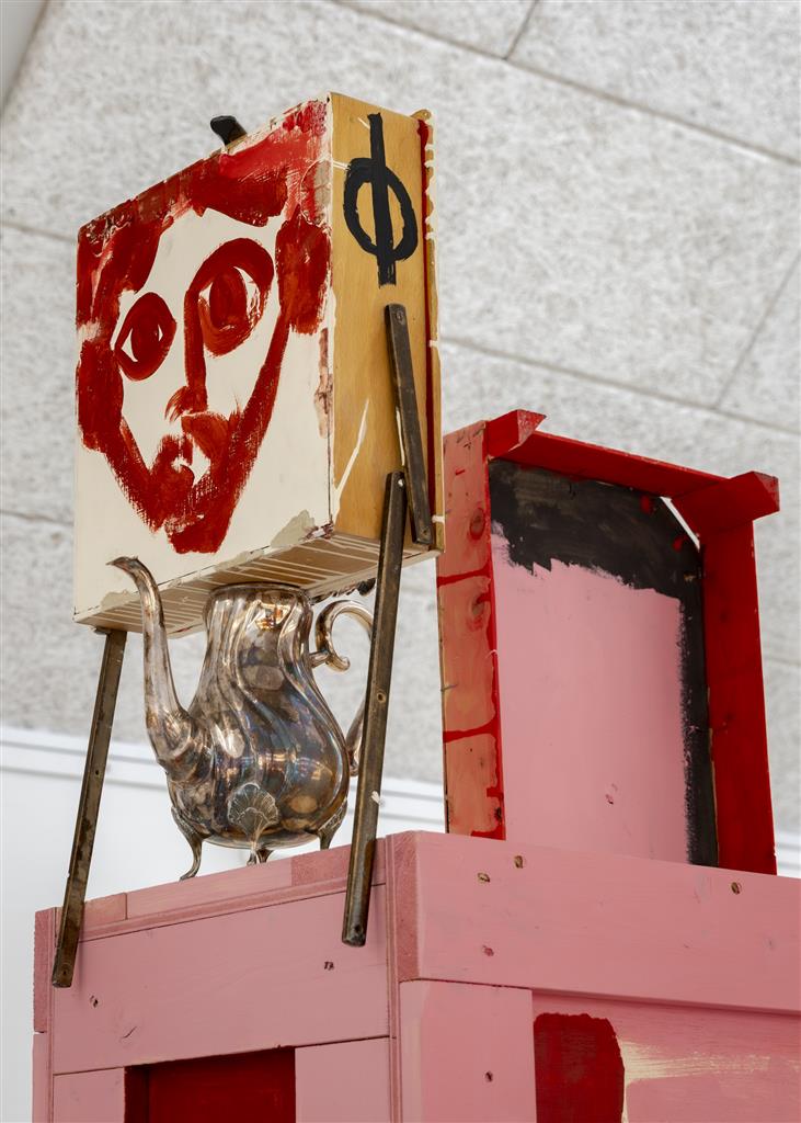 Selvom udstillingen umiddelbart slår mig at være et vidnesbyrd om både livsmod, hverdagsoptimisme og en smuk sammenhængskraft mellem mennesker, kan jeg alligevel ikke lade være med at dvæle længe ved et værk, der trods sit sprudlende, farverige ydre også rummer et alvorsord og en løftet pegefinger, der vil minde os om verdens storpolitiske konflikter – nemlig værket ‘The Chic Kids of Pasargad’ skabt af Farshad Farzankia i 2026 af genbrugte transportkasser. Værkets titel refererer til Perserrigets første hovedstad Pasargadae, der kan læses som en krog til Farzankias egen opvækst og det faktum, at han som barn flygtede til Danmark med sin familie i kølvandet på den iranske revolution.