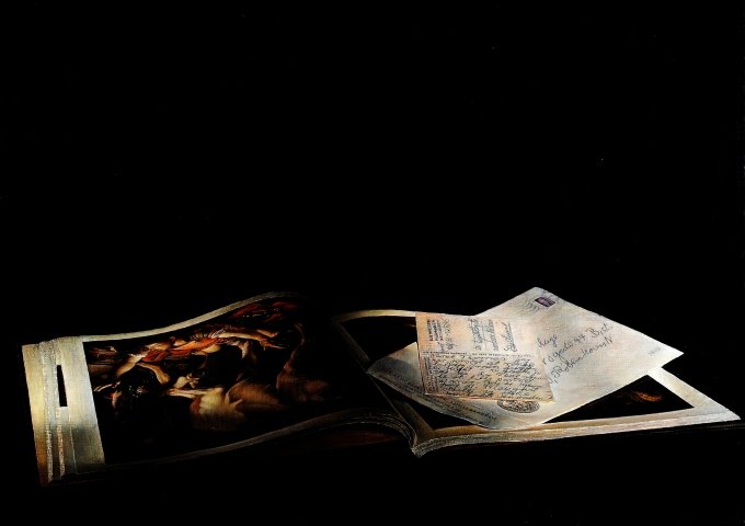 Hvis nogen skulle være i tvivl om Caravaggios betydning for Kluges kunst, toner tenebrismens (for nemhedens skyld kan vi kalde det chiaroscuroens) mester frem på det næste ‘dørstykke’, over indgangen til et rum hvor der hænger landskabsmalerier. Maleriet viser en åben bog, hvor Caravaggios Omvendelsen på vejen til Damascus ses i stærk perspektivisk forkortning og vendt på hovedet. Dette maleri viser Paulus væltet om på ryggen ved maleriets nedre kant, med armene i vejret, mens størstedelen af billedet vies den hest han er faldet af.