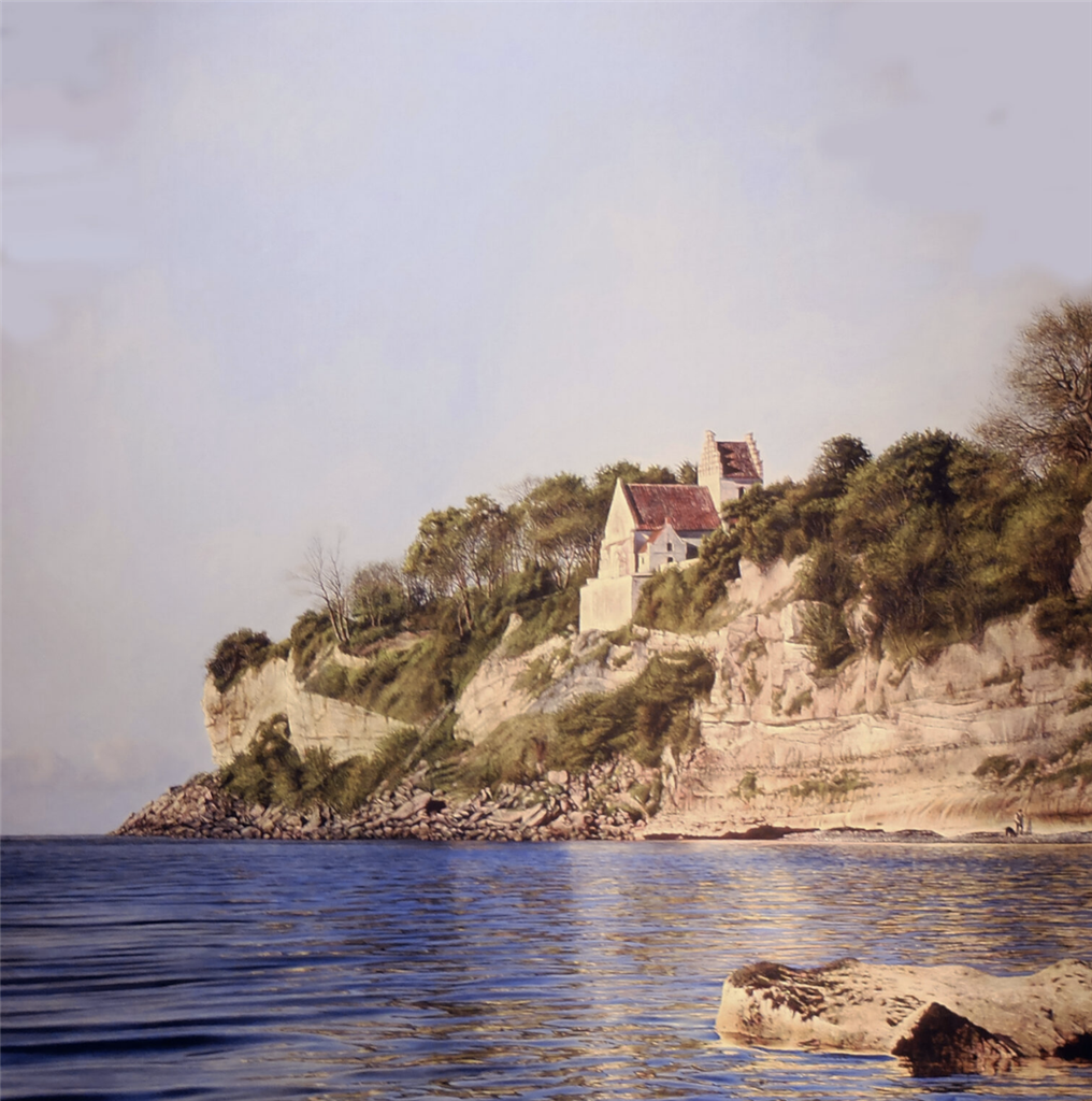 To sammenligninger kan anstilles, der går i hver sin retning. Den ene optræder direkte i udstillingens ophængning, ved at et lille men lysende P.C. Skovgaard-maleri af Møns Klint hænger på en af væggene. Her er den pågældende klint malet med en helt anderledes frihed, der koncentrerer sig om at gengive lysets spil på klintens flader. Farven er næsten lyserød i de lyse områder og blålig i skyggerne, sådan at klintens former tegnes af gengivelsen af lyset snarere end ved en forsøgsvis gengivelse af hver eneste form. Ligeledes er træernes bladrige kroner mere generelt angivet. Virkningen er levende, som sagt lysende, lyset gengivet i toner springer én i møde og ‘vil én noget’.