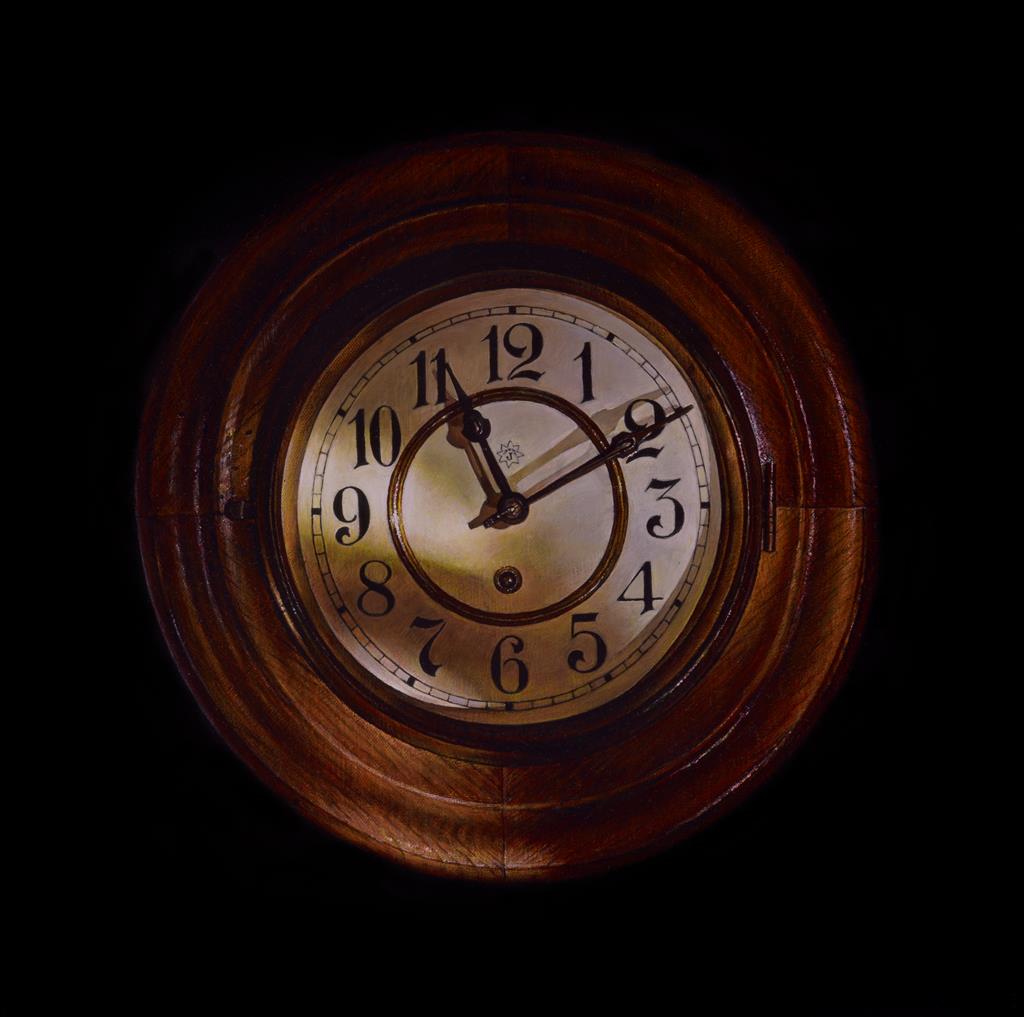 Thomas Kluge. Tid, akryl på lærred, 2020. Privateje. Uret repræsenterer helt enkelt tid, som er udstillingens tema. Viserne er placeret, så de angiver Thomas Kluges fødselstidspunkt d. 6. marts 1969. Pressefoto