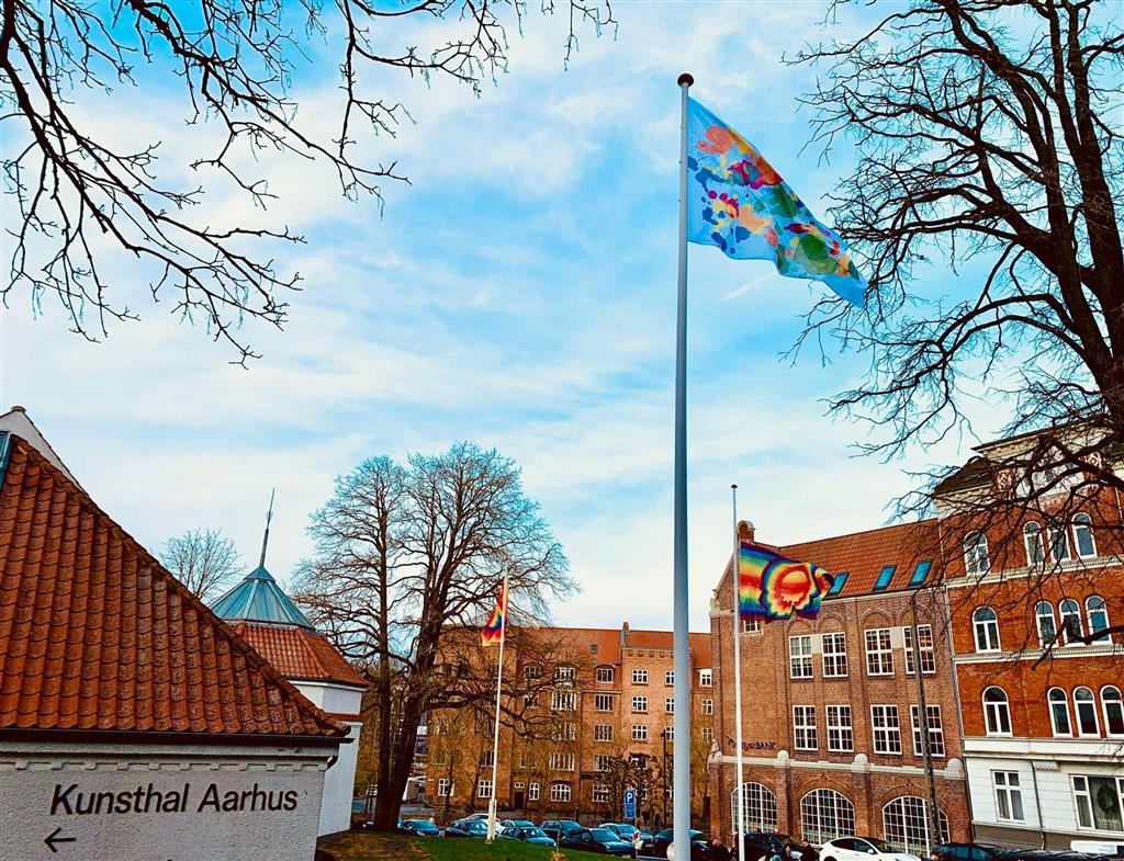 Da vi træder udenfor igen, ligger snedyngerne tykke som enorme skumfiduser i kunsthallens park. Midt i alt det grå og hvide blafrer multikulørte flag af kunstneren Ay-O. Siden 2017 har parken været ramme for den årlige kunstflagudstilling ’A Flag is a Piece of Fabric’, og i år er den japanske ’regnbuekunstner’ kurateret i samarbejde med Tiger Tanuki, ledet af kunsthistoriker Malene Wagner. De tre flagstænger kunne ved første øjekast se identiske ud, men trods flagenes ensartede palet, spænder udtrykkene fra abstrakt og plettet til det bølgende 70’er-silketryk med titlen ’Rainbow Bridge I’. Uvilkårligt søger mine øjne mod venstre, hvor Olafur Eliassons ikoniske regnbuepanorama troner på toppen af ARoS. Sådan kan to kunstmuseer tale sammen i vinterkulden og kommunikere med signalflag i forårets farver, mens sneen langsomt smelter og erstattes af et hav af mudder.