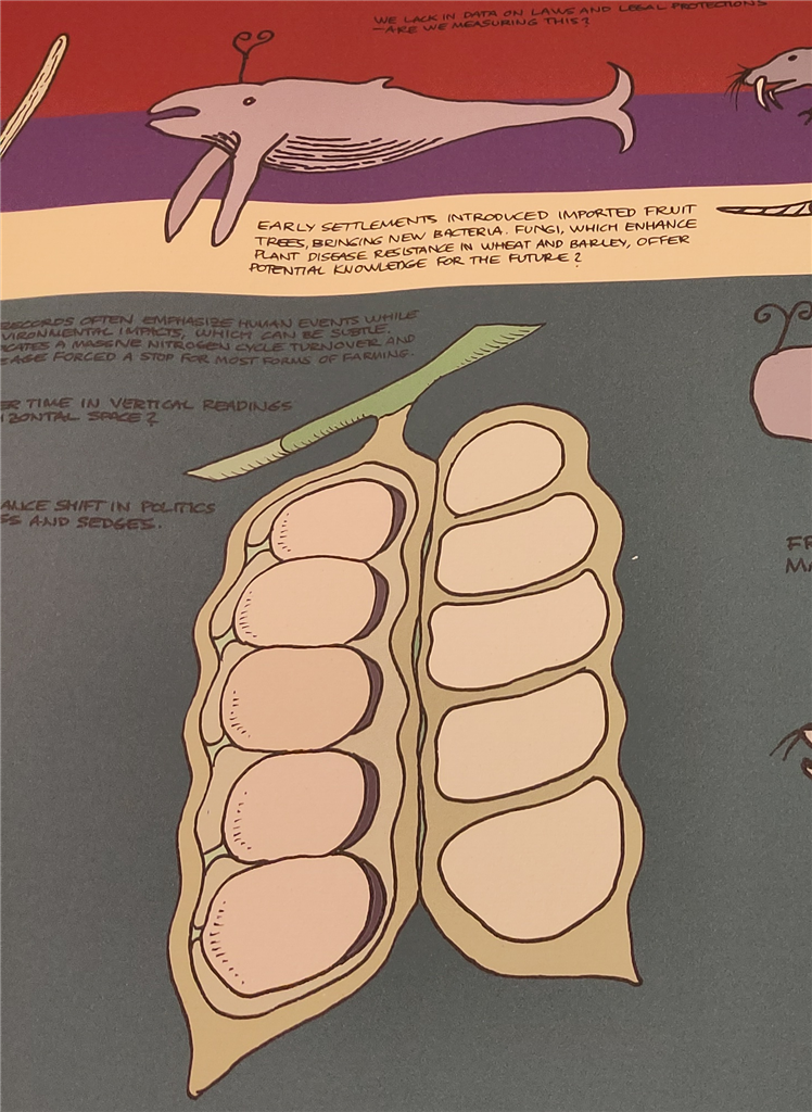 Illustrationerne bærer også præg af en legende tilgang til forskningsfeltet, trods dets foruroligende kendsgerninger. Farverne på de kæmpestore kortlignende værker minder mig om print fra gamle HAY-kollektioner; støvturkis, brun og skrig-koral i tilfredsstillende forening. Hvalerne synes at have ansigtsudtryk (én af dem smiler i hvert fald lidt) ved siden af tekster om manglende politisk kapacitet til at beskytte ’alien species’, og det er i dette møde mellem det seriøse ærinde og den finurlige behandling af selvsamme, at udstillingen skiller sig ud.