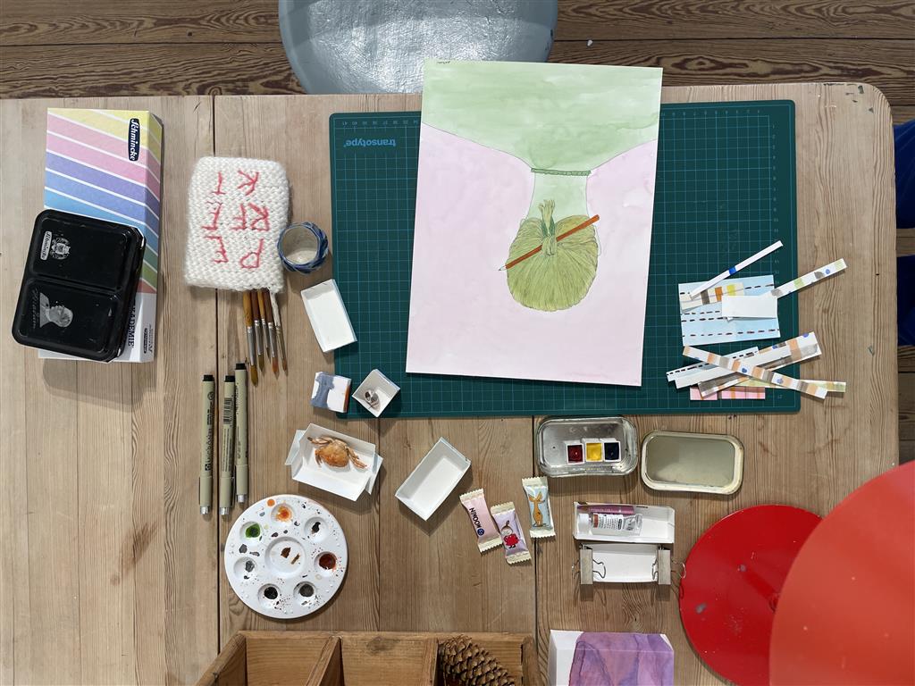 I rummet er der opstillet et arbejdsbord, med et eksempel på, hvordan en kunstners kreative proces kan se ud. Med de forskellige dele kan man tænke sig til, hvordan kunstneren analyserer og skitserer forskellige elementer til fremtidige tegninger. På væggene hænger der inspiration til, hvordan en sådan analyseproces kan se ud. Det er interessant at se de forskellige dele og tanker, der kan være bag et kunstværk, og hvordan de helt livsnære ting, som hvordan man stiller sit arbejdsbord op, kan blive til kunst.