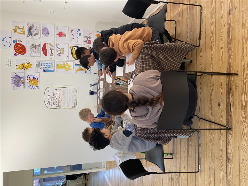 I rummet BYGNINGERNE er der en workshop, som sætter fokus på at tegne fantasifulde bygninger inspireret af reelle bygninger. På det ene bord er der billeder af bygninger, og på det andet opfordres du til at tegne en fantasibygning inspireret af billederne. Også disse tegninger kan hænges op og dermed bidrager man gennem hele udstillingen til SKITSEN. Jeg tegnede selv en bygning, og fandt det sjovt og forunderligt at tænke over, hvordan noget, som jeg normalt synes er ret kedeligt, kan blive fantasifuldt, sjovt og kreativt ved blot at sætte lidt øjne på.