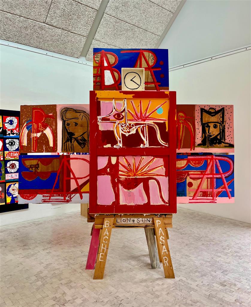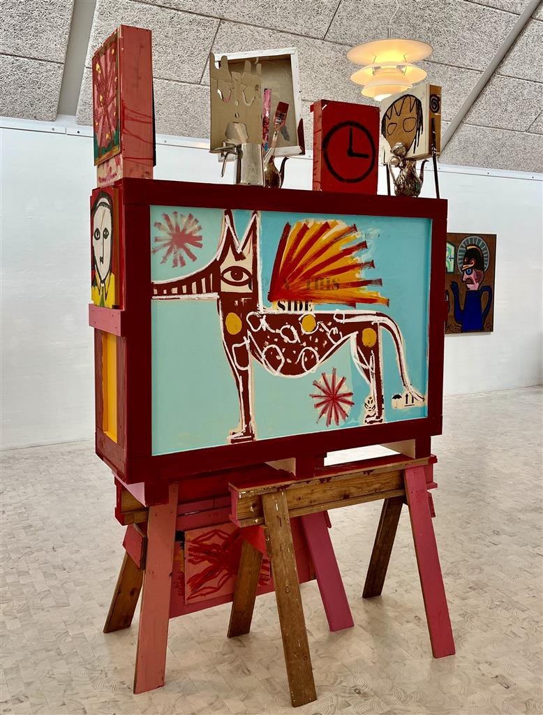Selvom udstillingen umiddelbart slår mig at være et vidnesbyrd om både livsmod, hverdagsoptimisme og en smuk sammenhængskraft mellem mennesker, kan jeg alligevel ikke lade være med at dvæle længe ved et værk, der trods sit sprudlende, farverige ydre også rummer et alvorsord og en løftet pegefinger, der vil minde os om verdens storpolitiske konflikter – nemlig værket ‘The Chic Kids of Pasargad’ skabt af Farshad Farzankia i 2026 af genbrugte transportkasser. Værkets titel refererer til Perserrigets første hovedstad Pasargadae, der kan læses som en krog til Farzankias egen opvækst og det faktum, at han som barn flygtede til Danmark med sin familie i kølvandet på den iranske revolution.